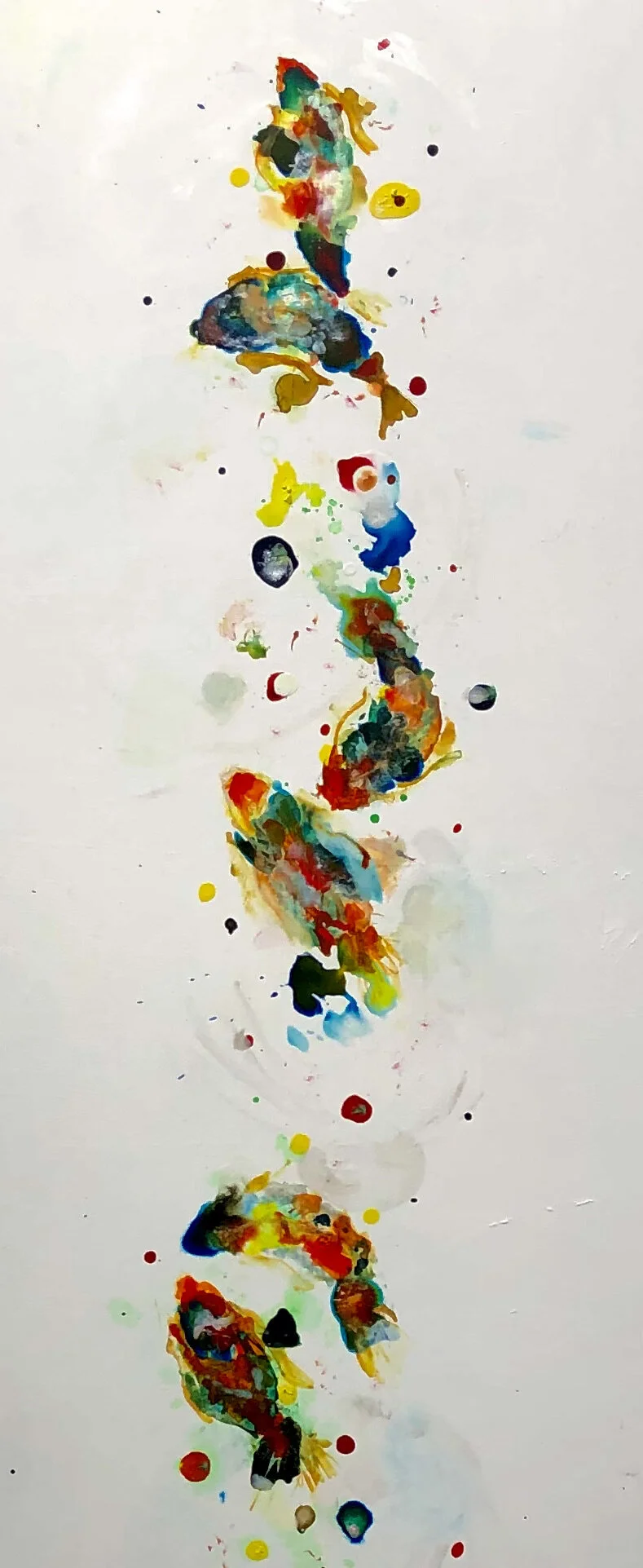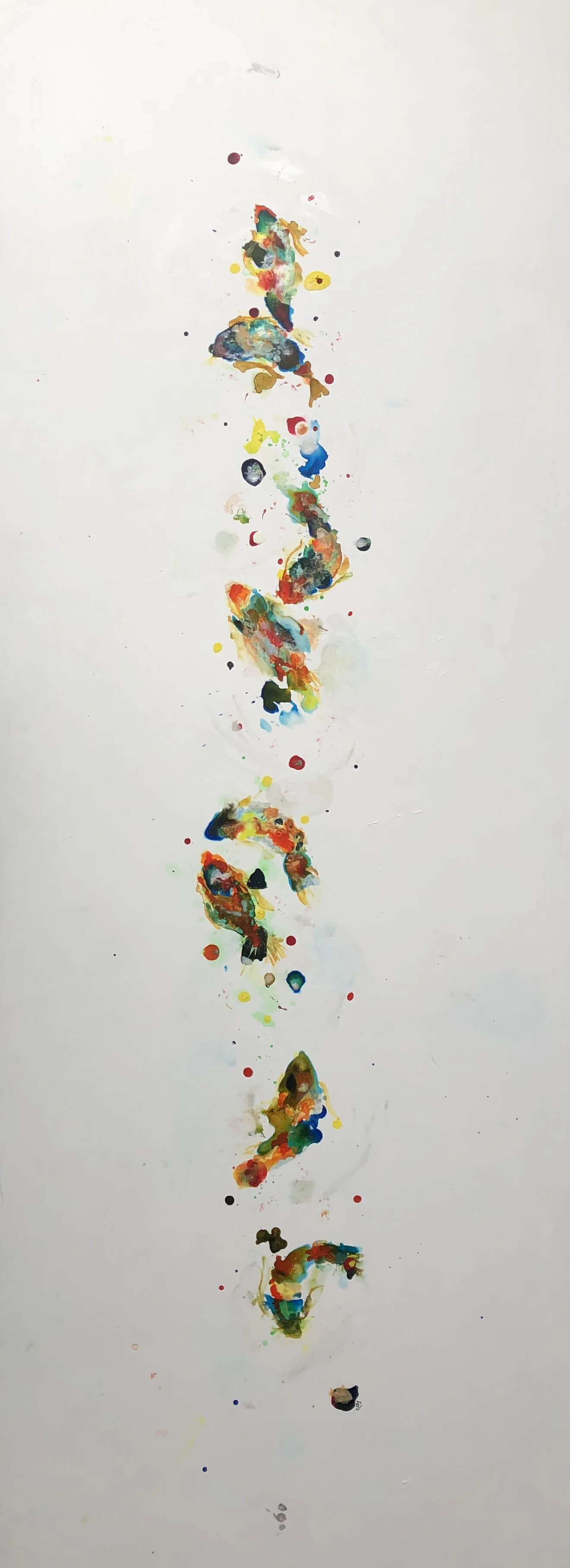 For this painting, I wanted to capture the peacefulness that koi seem to elicit in me. Although the fish are not as many-coloured in real life as they are depicted here, I painted them how I thought they would be if we had eyes to see all the sights they had seen.