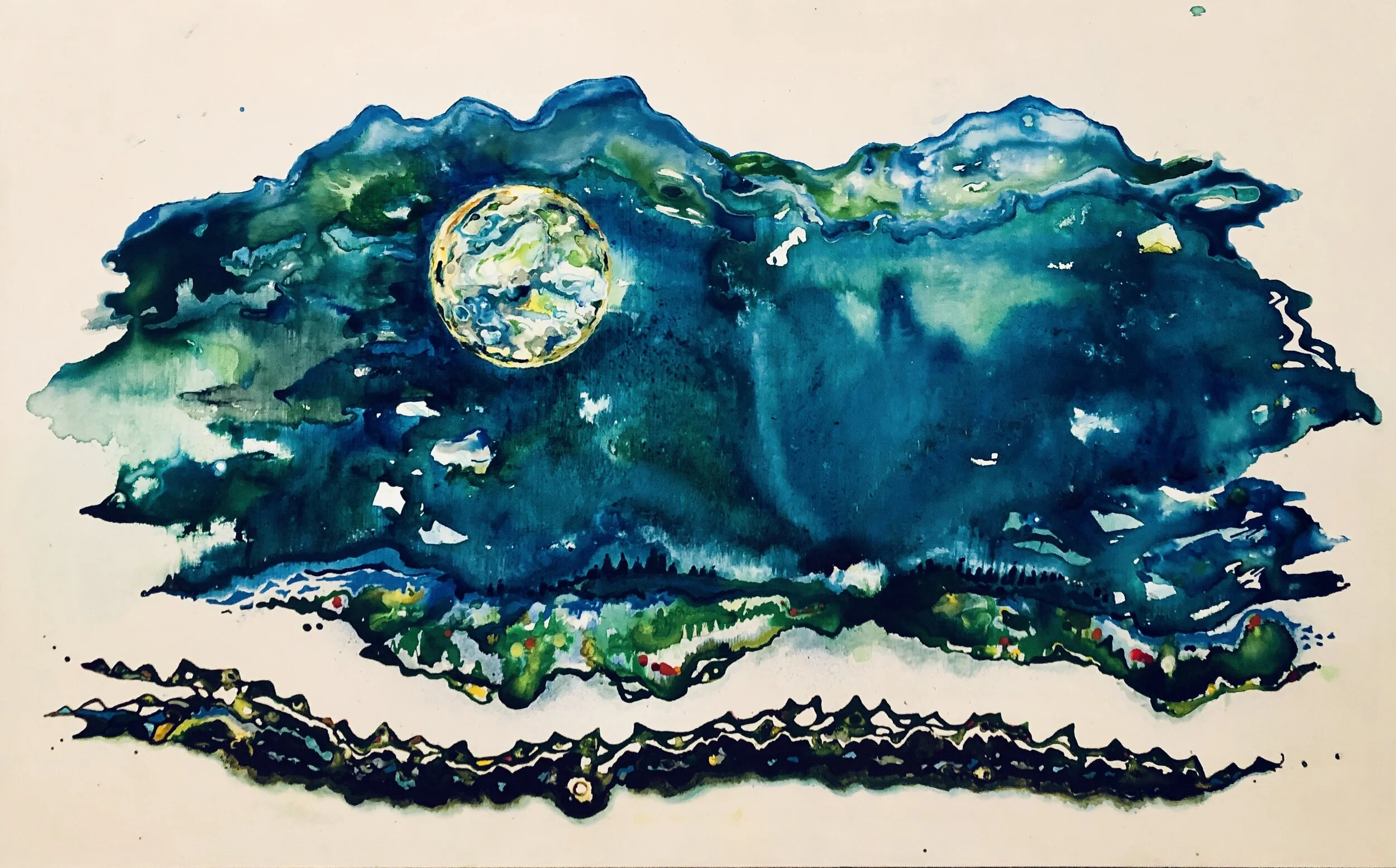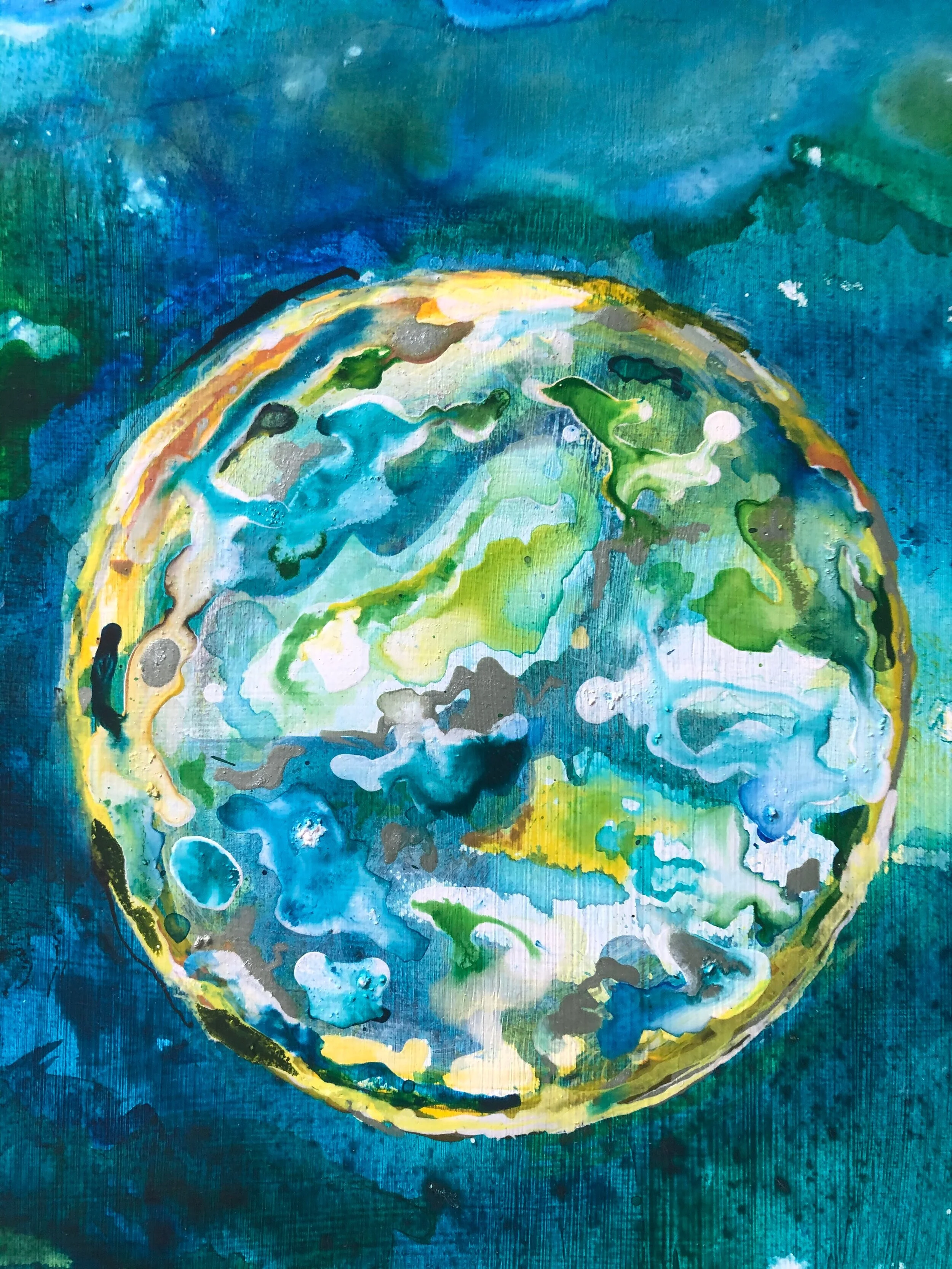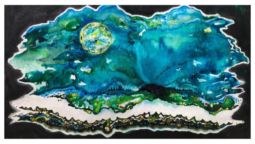 I poured the ink to the centre and it seemed that the Northern Lights formed all by themselves across the wood panel. This lead to the development of the moon and a hint of a town and people transfixed by the beauty overhead. At the very end, I decided to paint the background black and I think that it adds drama and context to the painting.